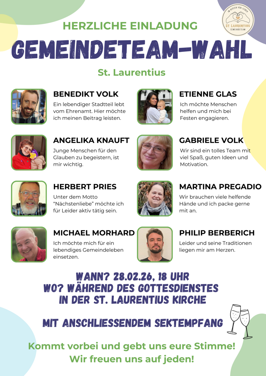 Das Gemeindeteam koordiniert und gestaltet, mit vielen Gruppierungen zusammen, das vielfältige Leben der Pfarrenegemeinschaft. Die Gemeindeteams repräsentieren Kirche vor Ort. Nehmen Sie Ihr Stimmrecht wahr und zeigen Sie den Kandidaten: Mitverantwortung ist wichtig und wertvoll.